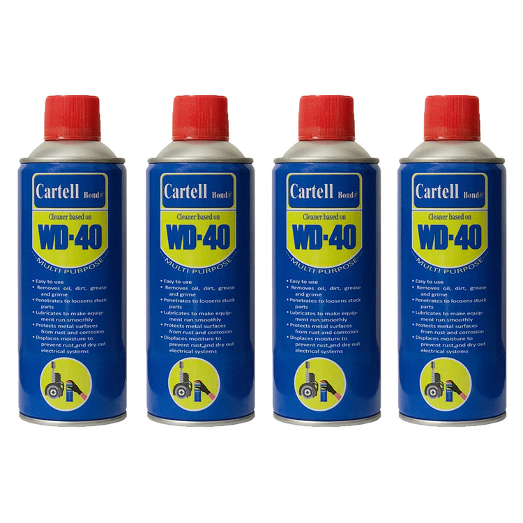 مجموعه 4 عددی اسپری WD-40 کارتل ، یک محصول همه کاره و معجزه آسا در مصارف خانگی و صنعتی می باشد . این محصول جهت روانکاری ، جرم زدایی و زنگ زدایی انواع لولاهای درب ، انواع قفل ، انواع پیچ و بطور کلی تمامی نواحی که جهت تمیز کردن و روانکاری قابل دسترسی نباشد کاربرد دارد . کاربردها : روانسازی انواع لولاها، قفلها، چرخدندهها، و سایر قطعات متحرک. جلوگیری از گیر کردن و کاهش اصطکاک اجسام. پاک کردن لکههای چربی، چسب، برچسب، آدامس و اثر ماژیک از سطوح مختلف. ایجاد یک لایه محافظتی بر روی سطوح فلزی جهت جلوگیری از نفوذ رطوبت و ایجاد زنگ زدگی. جلوگیری از یخ زدگی قفلها و قطعات متحرک. روانکاری قفل. تمیز کاری انواع قطعات خودرو از قبیل پیچ و مهرهها، لولاها، و سایر سطوح. روان سازی و تمیز کردن وسایل مختلف مانند شیرآلات، کلید و پریز، ابزارآلات و بسیاری از قطعات.