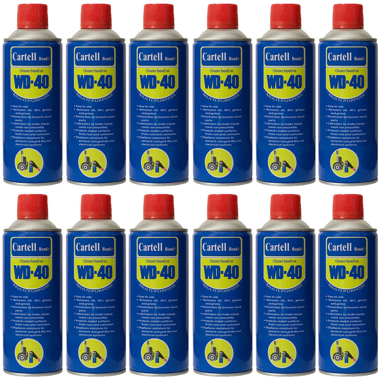مجموعه 12 عددی اسپری WD-40 کارتل ، یک محصول همه کاره و معجزه آسا در مصارف خانگی و صنعتی می باشد . این محصول جهت روانکاری ، جرم زدایی و زنگ زدایی انواع لولاهای درب ، انواع قفل ، انواع پیچ و بطور کلی تمامی نواحی که جهت تمیز کردن و روانکاری قابل دسترسی نباشد کاربرد دارد . کاربردها : روانسازی انواع لولاها، قفلها، چرخدندهها، و سایر قطعات متحرک. جلوگیری از گیر کردن و کاهش اصطکاک اجسام. پاک کردن لکههای چربی، چسب، برچسب، آدامس و اثر ماژیک از سطوح مختلف. ایجاد یک لایه محافظتی بر روی سطوح فلزی جهت جلوگیری از نفوذ رطوبت و ایجاد زنگ زدگی. جلوگیری از یخ زدگی قفلها و قطعات متحرک. روانکاری قفل. تمیز کاری انواع قطعات خودرو از قبیل پیچ و مهرهها، لولاها، و سایر سطوح. روان سازی و تمیز کردن وسایل مختلف مانند شیرآلات، کلید و پریز، ابزارآلات و بسیاری از قطعات.